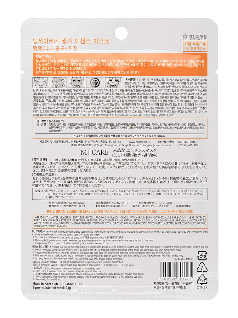 МЖ Essence Маска тканевая для лица Рисовые отруби Rice Bran Essence Mask 23гр
