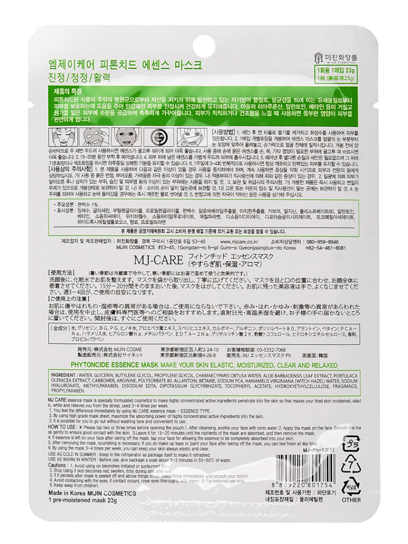 Изготовитель: MIJIN COSMETICS, Республика Корея, 53-45, 1 Gongdan-ro 6-gil, Gumi-si Gyeongsangbuk-do. Подходит для всех типов кожи. Phytoncide выделяют растения для того, чтобы защитить себя от опасности развития бактерий и грибков. Его мощный антибактериальный эффект обеспечивает защиту и помогает успокоить чувствительную и раздраженную кожу. Фитонциды также осветляют и омолаживают уставшую тусклую кожу. Восстанавливают после воздействия ультрафиолетовых лучей. Эффективно борятся с пигментными пятнами, делая лицо ярким и здоровым, глубоко увлажняют, обеспечивая коже мягкость и эластичность.Способ применения:Поместите маску на очищеное лицо обеспечив хороший контакт с кожей лица. Снимите через 20 минут. Оставшуюся на лице эссенцию распределите до полного впитывания.Объем:23гр