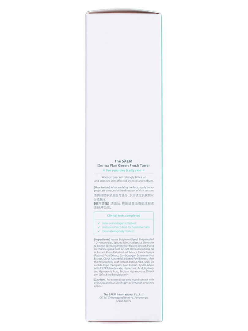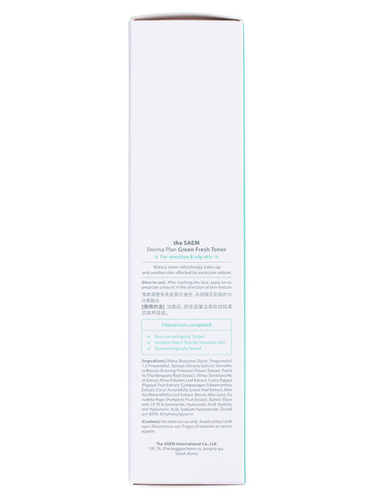 Изготовитель: "THE SAEM INTERNATIONAL CO.LTD."., КОРЕЯ, РЕСПУБЛИКА, 10F, 35, Cheonggyecheon-ro, Jongno-gu, Seoul. Освежающий тонер для чувствительной кожи THE SAEM DERMA PLAN Green Fresh Toner содержит экстракт примулы вечерней, экстракт корня кудзу, экстракт сосны, экстракт папайи, экстракт лайма, экстракт яблочной мяты, сок березы маньчжурии, гиалуроновую кислоту. Содержит комплекс специализированных ингредиентов, направленных на лечение и уход за проблемной кожей лица. Быстро снимает стресс и раздражение проблемной кожи. Ферменты, содержащиеся в экстрактах папайи, кожуры лайма, яблочной мяты обеспечивают свежесть кожи, контролируют работу сальных желез, сужают поры и очищают их от загрязнений и токсинов. Применение: Нанесите средство на ватный диск, мягко протрите кожу.