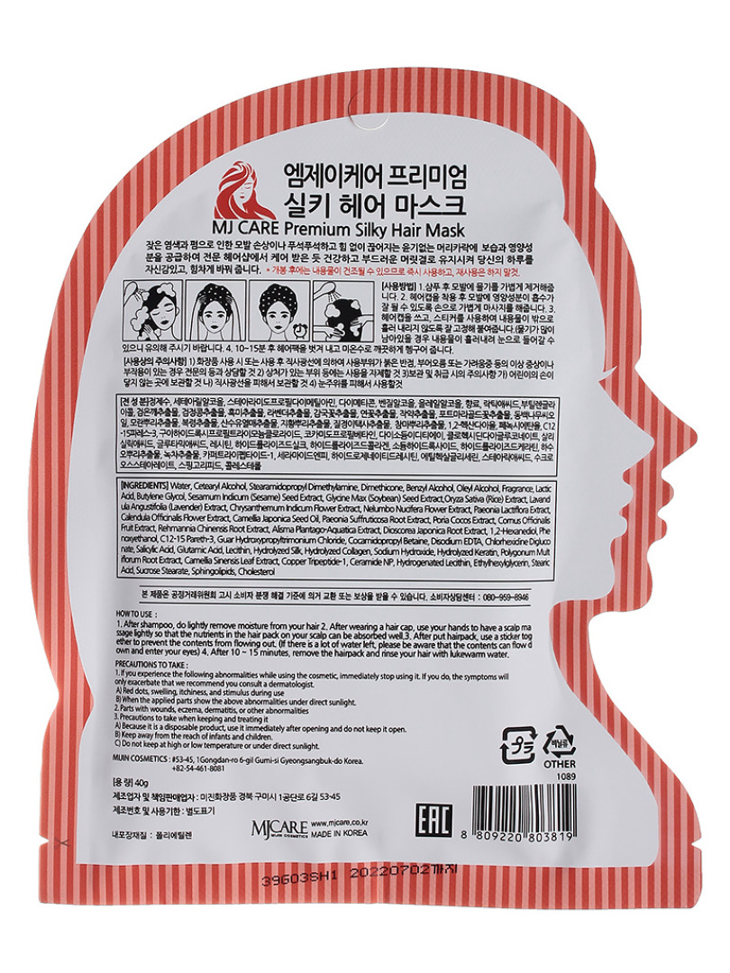 Изготовитель: «MIJIN COSMETICS », Южная Корея. 53-45, 1 Gongdan-ro 6 Gil, Gumi-si, Gyeongsangbuk-do. Маска для волос MJ CARE SILKY HAIR MASK обладает удивительной влажностью, невероятным блеском и экстремальной защитой для ваших волос. Эта интенсивная кондиционирующая процедура обеспечит полное восстановление эластичности волос и придаст прочность корням волос, одновременно смягчая волосы. Применение: Высушите волосы полотенцем после мытья шампунем MJ Hair Shampoo. Возьмите необходимое количество маски для волос на ладонь. Потрите ладони друг о друга и нанесите средство на волосы. Расчесывайте по всей длине от корней до кончиков. Наденьте шапочку и оставьте на волосах на 15 минут. Тщательно промойте и приступайте к укладке.