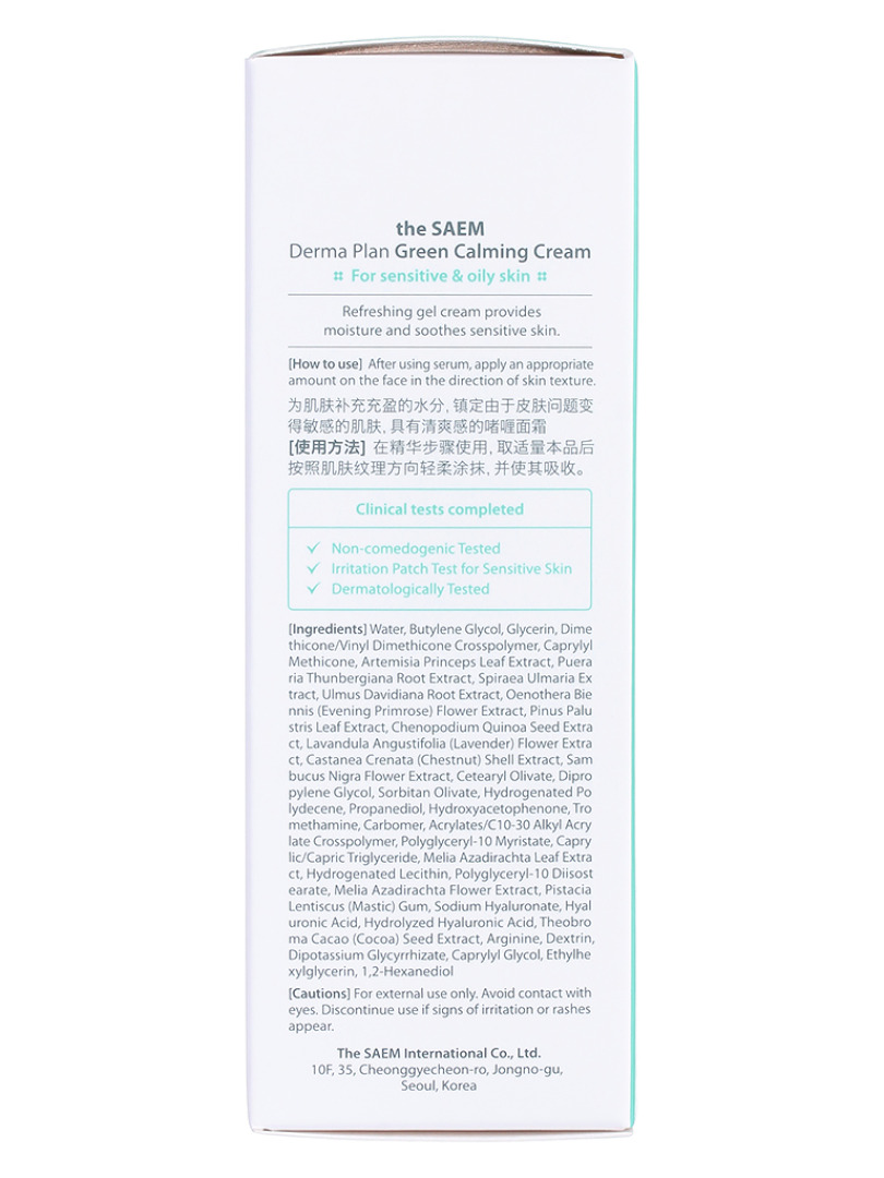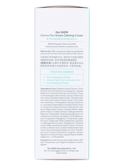 Изг-ль: «THE SAEM INTERNATIONAL CO.LTD. », КОРЕЯ, РЕСПУБЛИКА, 10F, 35, Cheonggyecheon-ro, Jongno-gu, Seoul. Успокаивающий крем для чувствительной кожи THE SAEM DERMA PLAN Green Calming Cream содержит экстракты примулы вечерней, корня кудзу, сосны, давидиана, пенника лугового, бузины, полыни, семян квиноа, лаванды. Гель-крем удерживает влагу, обеспечивает насыщенную гидратацию кожи, без образования липкости, сохраняет кожу свежей и мягкой. Применение: нанесите средство на кожу мягкими движениями, дайте время средству впитаться.