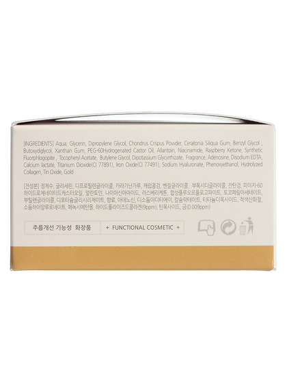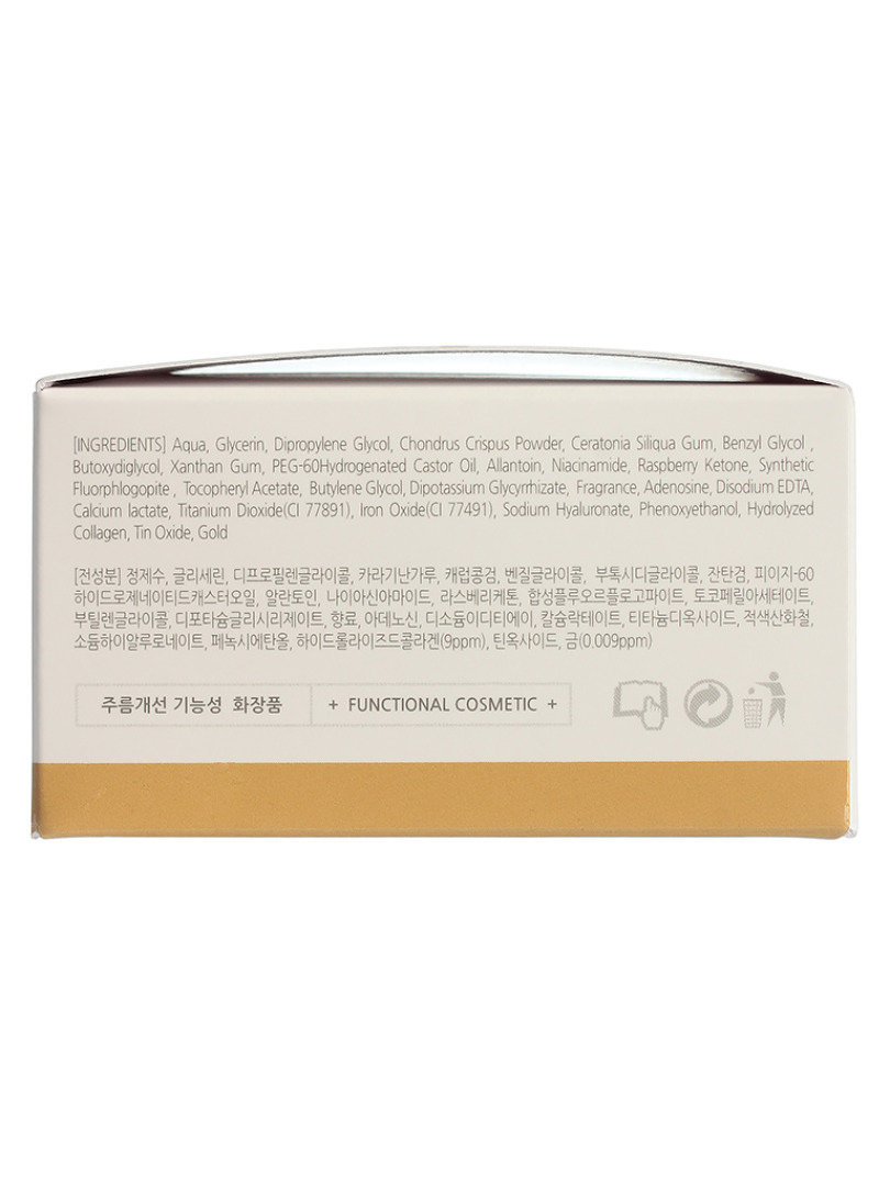 Aqua(Water), Glycerin, Dipropylene Glycol, Chondrus Crispus Powder, Ceratonia Siliqua Gum, Benzyl Glycol, Butoxydiglycol, Xanthan Gum, PEG—60Hydrogenated Castor Oil, Allantoin, Niacinamide, Raspberry Ketone, Synthetic Fluorphlogopite, Tocopheryl Acetate, Butylene Glycol, Dipotassium Glycyrrhizate, Fragrance, Adenosine, Disodium EDTA, Calcium lactate, Titanium Dioxide(Cl 77891), Iron Oxide(Cl 77491), Sodium Hyaluronate, Phenoxyethanol, Hydrolyzed Collagen, Tin Oxide, Gold