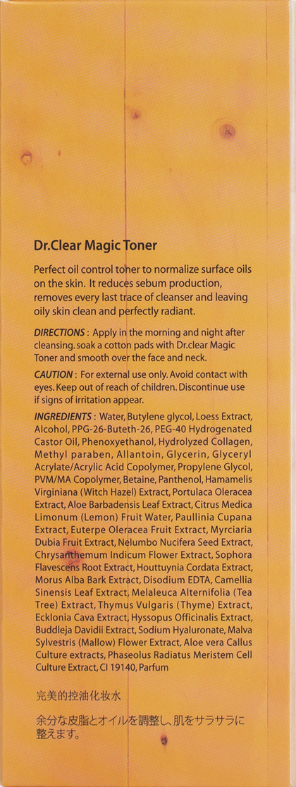 Water, 1,3 Butylene glycol, Loess Extract, Alcohol, PPG-26-Buteth-26, PEG-40 Hydrogenated Castor Oil, Phenoxyethanol, Hydrolyzed Collagen, Perfume, Methyl paraben, Allantoin, Glycerin, Glyceryl Acrylate/Acrylic Acid Copolymer, Propylene Glycol, PVM/MA Copolymer, Betaine, Panthenol, Hamamelis Virginiana (Witch Hazel) Extract, Portulaca Oleracea Extract, Aloe Barbadensis Leaf Extract, Citrus Medica Limonum (Lemon) Fruit Water, Paullinia Cupana Extract, Euterpe Oleracea Fruit Extract, Nelumbo Nucifera Seed Extract, Chrysanthemum Indicum Flower Extract, Sophora Flavescens Root Extract, Houttuynia Cordata Extract, Morus Alba Bark Extract, Disodium EDTA, CI 19140, Camellia Sinensis Leaf Extract, Melaleuca Alternifolia (Tea Tree) Extract, Thymus Vulgaris (Thyme) Extract, Ecklonia Cava Extract, Hyssopus Officinalis Extract, Buddleja Davidii Extract, Sodium Hyaluronate, Malva Sylvestris (Mallow) Flower Extract, Aloe vera Callus Culture extracts, Phaseolus Radiatus Meristem Cell Culture Extract