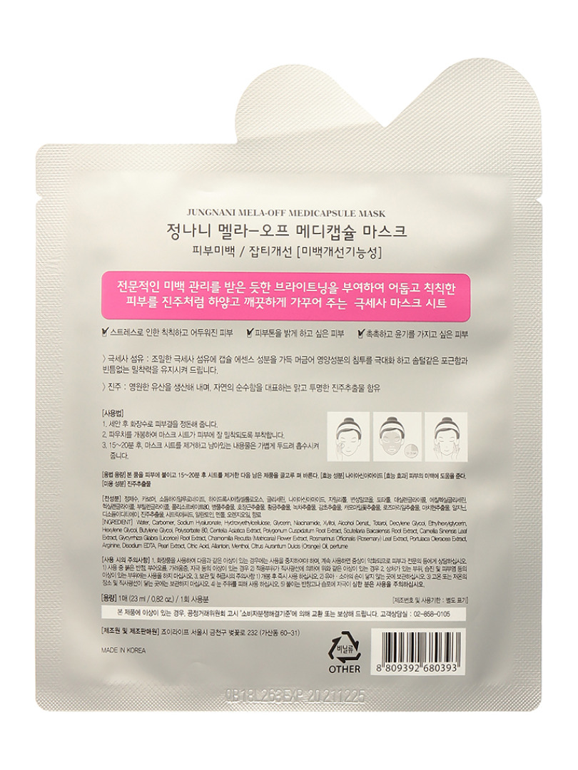 Производитель: «JOY LIFE Co. Ltd. », 232, Beotkkot-ro, Geumcheon-gu, Seoul, РЕСП. КОРЕЯ. Интенсивная маска для экспресс-ухода за кожей, а также для курсового применения. Каждая маска содержит свой ключевой компонент и позволяет решить различные проблемы кожи. Mela-Off Medicapsule Mask – осветляющая с жемчугом
