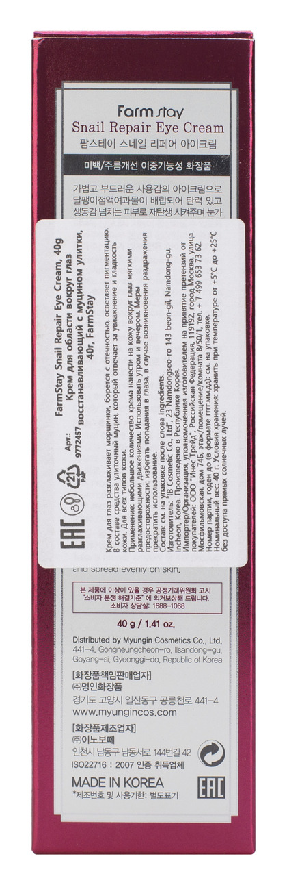 MYUNGIN COSMETICS CO. LTD., 441-4, Gongneungcheon-ro, Ilsandong-gu, Goyang-si, Gyeonggi-do, РЕСП. КОРЕЯ. Крем для глаз с улиточным муцином разглаживает морщинки, борется с припухлостями, осветляет пигментацию. После различных неприятных ситуаций (солнечных ожогов, акне, воспалений, обветриваний и обморожений, высыпаний, аллергических реакций, в период авитаминоза, после процедур пилинга и других) дерме нужен не только более бережный и тщательный уход, но и активное восстановление. Восстанавливающий комплекс крема на основе улиточного муцина активизирует собственные регенерирующие процессы, ускоряет процессы заживления, а также решает ряд других косметических проблем с дермой. В составе средства улиточный муцин, который отвечает за увлажнение и гладкость кожи. Для всех типов кожи. Способ применения: Нанести крем на очищенную кожу вокруг глаз легкими "постукивающими" движениями.