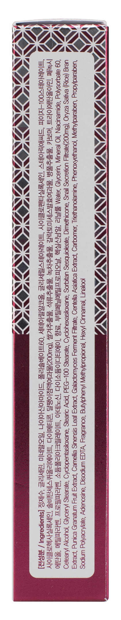 Water, Glycerin, Mineral Oil, Niacinamide, Polysorbate60, Cetearyl Alcohol, Glyceryl Stearate, Cyclopentasiloxane, Stearic acid, PEG-100 Stearate, Cyclohexasiloxane, Sorbitan Sesquioleate, Dimethicone, Snail Secretion Filtrate200mg, Oryza Sativa(Rice)Bran Extract, Punica Granatum Fruit Extract, Camellia Sinensis Leaf Extract, Galactomyces Ferment Filtrate, Centella Asiatica Extract, Carbomer, Triethanolamine, Phenoxyethanol, Methylparaben, Propylparaben, Sodium Polyacrylate, Adenosine, Disodium EDTA, Fragrance