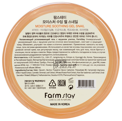 MYUNGIN COSMETICS CO. LTD., 441-4, Gongneungcheon-ro, Ilsandong-gu, Goyang-si, Gyeonggi-do, РЕСП. КОРЕЯ. Универсальный, смягчающий улиточный гель для заботливого ухода за кожей лица. Данный гель также ежедневно можно использовать для нанесения на тело и волосы. Гель является восстанавливающим, увлажняющим, растительным и защитным средством. При повседневном нанесении уходят сухость, раздражения, шелушения, аромат и свежесть сохраняется на длительный срок. Кроме того, гель может служить как маска для глаз, как база перед нанесением косметических средств, как успокаивающая эссенция после бритья, как гель-крем для рук и как средство для волос. В состав улиточного геля входят ферменты слизи улитки, которые обновляют клетки кожного покрова, прекрасно помогают при ожогах, затягивают шрамы и раны, борются с расширенными порами, устраняют акне и угревые скопления, отбеливают пигментацию и веснушки и т.д. Способ применения: Нанесите необходимое количество геля на кожу или волосы. Дайте впитаться.