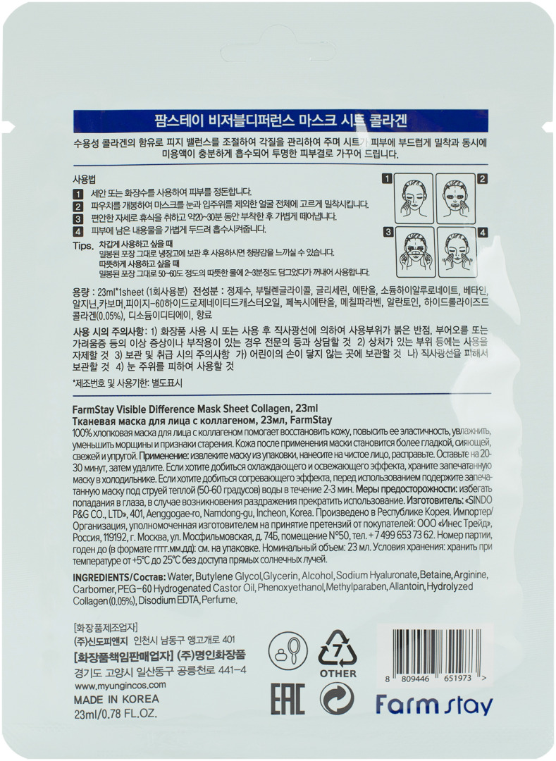 MYUNGIN COSMETICS CO. LTD., 441-4, Gongneungcheon-ro, Ilsandong-gu, Goyang-si, Gyeonggi-do, РЕСП. КОРЕЯ. Маска для лица с коллагеном помогает восстановить кожу, повысить эластичность, увлажнить, уменьшить морщины и признаки старения кожи. Маска для лица с коллагеном cделает кожу сияющей, более молодой, свежей и чистой, помогает восстановить кожу, повысить эластичность, увлажнить, уменьшить морщины и признаки старения кожи. Кожа после применения маски становится сияющей, более молодой, свежей и чистой. В состав маски также входит: гиалуроновая кислота, аргинин, аллантоин и бетаин. Cпособ применения:Нанесите маску на чистую кожу лица, аккуратно расправьте, оставьте на 20-30 минут. Удалите маску. Распределите остатки средства легкими постукивающими движениями, дайте впитаться.