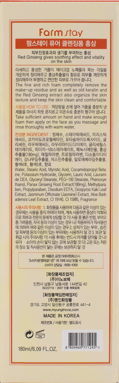 MYUNGIN COSMETICS CO. LTD., 441-4, Gongneungcheon-ro, Ilsandong-gu, Goyang-si, Gyeonggi-do, РЕСП. КОРЕЯ. Пенка для умывания с экстрактом корня красного женьшеня способствует восстановлению клеток эпидермиса, регулирует водный баланс кожи, защищая её от обезвоживания, улучшает циркуляцию крови. Экстракт корня женьшеня, явдяется антивозрастным ингредиентом, интенсивное тонизирующее средство, содержит высокое количество аминокислот и витамины группы В, благодаря чему способен защитить кожу от негативного воздействия окружающей среды и обеспечить необходимым питанием. В составе пенки так же содержится миристиновая, стеариновая, лауриновая кислоты и органические экстракты, вытяжка из красного женьшеня, зеленого чая, экстракт оливы. Способ применения: На влажное лицо нанести горошину средства. Массирующими движениями равномерно распределить, после вспенивания смыть все загрязнения.