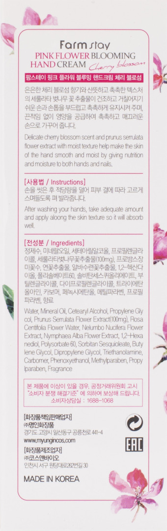 MYUNGIN COSMETICS CO. LTD., 441-4, Gongneungcheon-ro, Ilsandong-gu, Goyang-si, Gyeonggi-do, РЕСП. КОРЕЯ. Серия невероятно весенних, невероятно цветочных кремов для ухода за кожей рук. Текстура крема легкая, освежающая – такая же, как и аромат этого средства. Кожа после применения крема – такая же нежная, как изумительные цветочные лепестки. Кроме цветочных экстрактов в составе кремов ниацинамид (осветление пигментации и выравнивание тона кожи), аденозин (разглаживание морщин), гиалуроновая кислота (интенсивное увлажнение), витамин E ( антиоксидантная защита, предупреждение раннего увядания кожи). Крем для рук с экстрактом лепестков вишневого цвета. Экстракт цветков вишни оказывает увлажняющее, освежающее и тонизирующее действие, обладает противовоспалительными свойствами и помогает справиться с различными раздражениями, устраняет шелушения, смягчает и разглаживает кожу. Способ применения: Нанести на чистую сухую кожу рук мягкими массажными движениями.