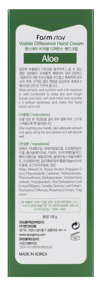 MYUNGIN COSMETICS CO. LTD., 441-4, Gongneungcheon-ro, Ilsandong-gu, Goyang-si, Gyeonggi-do, РЕСП. КОРЕЯ. Нежная кожа рук нуждается в ежедневном увлажнении и постоянной защите. Это поможет сохранить ее красоту и бархатистость. Превосходным вариантом для ухода за кожей станет данный крем, состоящий из натуральных компонентов. Алоэ вера отлично увлажняет нормальную и сухую кожу, успокаивает чувствительную, омолаживает зрелую. Экстракт алоэ запускает процесс омоложения на клеточном уровне: стимулирует обмен веществ, улучшает кровообращение, регулирует метаболические процессы, способствует образованию коллагена и эластина, незаменимых для красоты и молодости кожи. Крем с алоэ вера разглаживает кожу, способствует заживлению воспалений. Способ применения: Нанести на чистые руки, помассировать до впитывания.