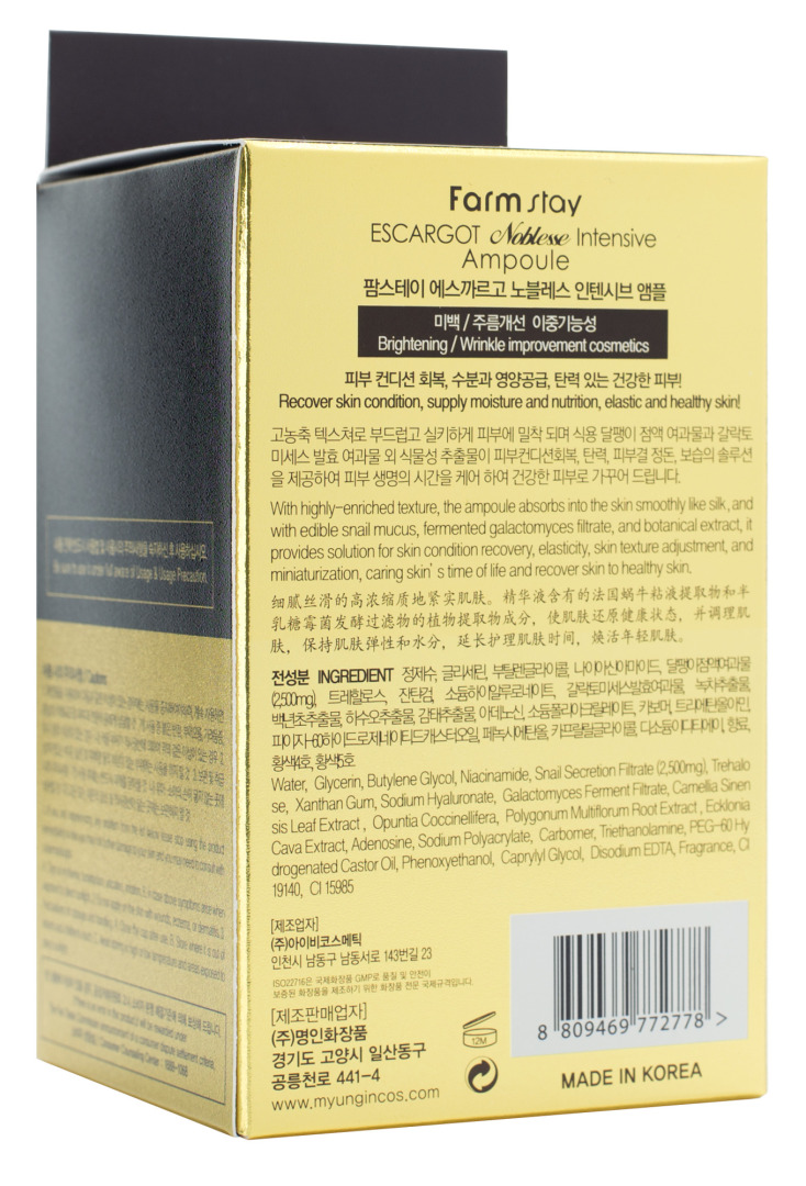 MYUNGIN COSMETICS CO. LTD., 441-4, Gongneungcheon-ro, Ilsandong-gu, Goyang-si, Gyeonggi-do, РЕСП. КОРЕЯ. Многофункциональная сыворотка, которая идеально подойдет для ухода за зрелой кожей. Ее активные компоненты обеспечивают быстрое восстановление клеток, придают коже здоровый, молодой и сияющий вид. Главный компонент – улиточная слизь. Она заметно омолаживает кожу, обеспечивает ее глубокое увлажнение и полноценное питание. Экстракт улитки содержит много ценных веществ: аллантоин – способствует обновлению клеток, коллаген – поддерживает упругость кожи и препятствует ее деформации, витаминный комплекс – интенсивно питает кожу, оберегает ее от любых воздействий, гликолевая кислота – мягко убирает отмершие клетки, снимает воспаления. Способ применения: Нанести сыворотку на чистую кожу и распределить массирующими движениями.