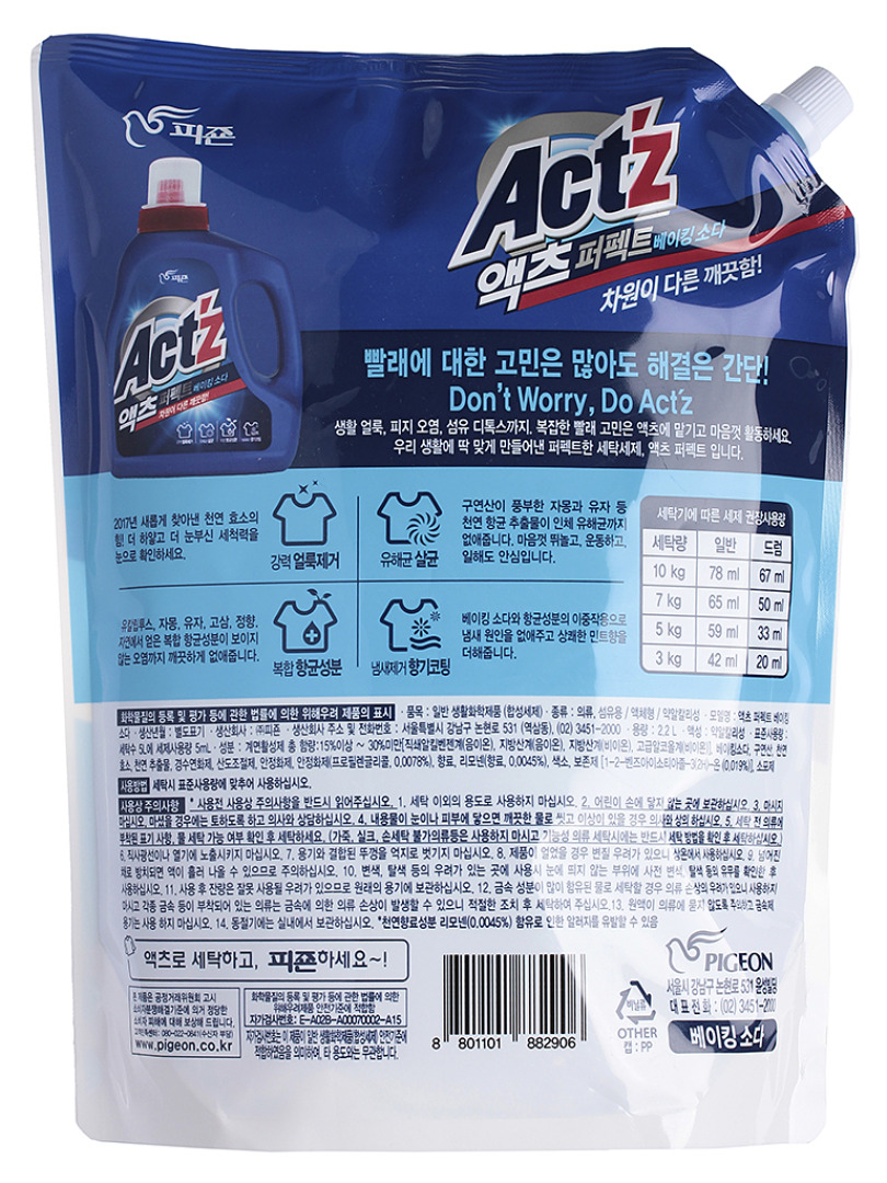 Изг-ль: PIGEON CORPORATION, КОРЕЯ, РЕСПУБЛИКА, 628-13, Yoksam-dong, Kangnam-ku, Seul, 135-080. Концентрированное гелеобразное моющее средство для стирки в автоматических стиральных машинах. Предотвращает обесцвечивание, перекрашивание, сжатие ткани. 100% растворимость (также в холодной воде): ферменты проникают глубоко в волокна ткани и расщепляют все виды загрязнений. Безопасно для кожи человека. Не содержит консервантов, фосфатов. Подходит для цветных тканей. Дозировка: машинная стирка – на 30 л воды (3 кг белья) – 20 мл геля, на 40 л воды (4 кг белья) – 29 мл, на 50 л воды (5 кг белья) – 36 мл геля. Меры предосторожности: соблюдать дозировку; не лить на ткань; беречь от детей.