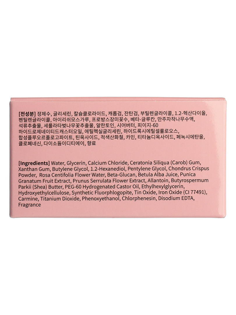 Water, Glycerin, Calcium Chloride, Ceratonia Siliqua (Carob) Gum, Xanthan Gum, Butylene Glycol, 1,2-Hexanediol, Pentylene Glycol, Chondrus Crispus Powder, Rosa Centifolia Flower Water, Beta-Glucan, Betula Alba Juice, Punica Granatum Fruit Extract, Prunus Serrulata Flower Extract, Allantoin, Butyrospermum Parkii (Shea) Butter, PEG-60 Hydrogenated Castor Oil, Ethylhexylglycerin, Hydroxyethylcellulose, Synthetic Fluorphlogopite, Tin Oxide, Iron Oxide (CI 77491), Carmine, Titanium Dioxide, Phenoxyethanol, Chlorphenesin, Disodium EDTA, Fragrance.