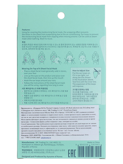 Способ применения: При необходимости регулировки размера отверстий для ушей вырезать по линиям до необходимого размера.Наложить на очищенное лицо маску,либо нанести уходовое средство,сверху приложить силиконовую маску и зафиксировать за ушными раковинами,после использования промыть водой и высушить естественным путем. Кол-во: 1шт.Состав: silicone.8806358593445 Срок годности не ограничен.Информацию на наклеенном считать верной и приоритетной.