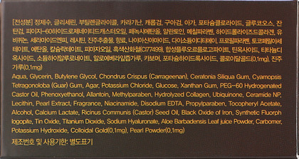 Aqua, Glycerin, Butylene Glycol, Chondrus Crispus (Carrageenan), Ceratonia Siliqua Gum, Cyamopsis Tetragonoloba (Guar) Gum, Agar, Potassium Chloride, Glucose, Xanthan Gum, PEG-60Hydrogenated Castor Oil, Phenoxyethanol, Allantoin, Methylparaben, Hydrolyzed Collagen, Ubiquinone, Ceramide 3, Lecithin , Pearl Extract, Fragrance, Niacinamide, Disodium EDTA, Propylparaben, Tocopheryl Acetate, Alcohol (0,1%), Calcium lactate, Ricinus Communis (Castor) Seed Oil, Black Oxide of Iron, Synthetic Fluorphlogopite, Tin Oxide, Titanium Dioxide, Sodium Hyaluronate, Aloe Barbadensis Leaf juice Powder, Carbomer, Potassium Hydroxide, Colloidal Gold(0.1mg), Pearl Powder (0.1mg).