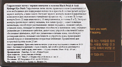Изготовитель: MYUNGIN COSMETICS CO. LTD., 441-4, Gongneungcheon-ro, Ilsandong-gu, Goyang-si, Gyeonggi-do, РЕСП. КОРЕЯ. Гидрогелевые патчи пропитаны высококонцентрированной сывороткой с увлажняющим и разглаживающим эффектом. Экстракт черного жемчуга осветляет кожу вокруг глаз, а золото – прекрасный антиоксидант, который предотвращает появление морщин.