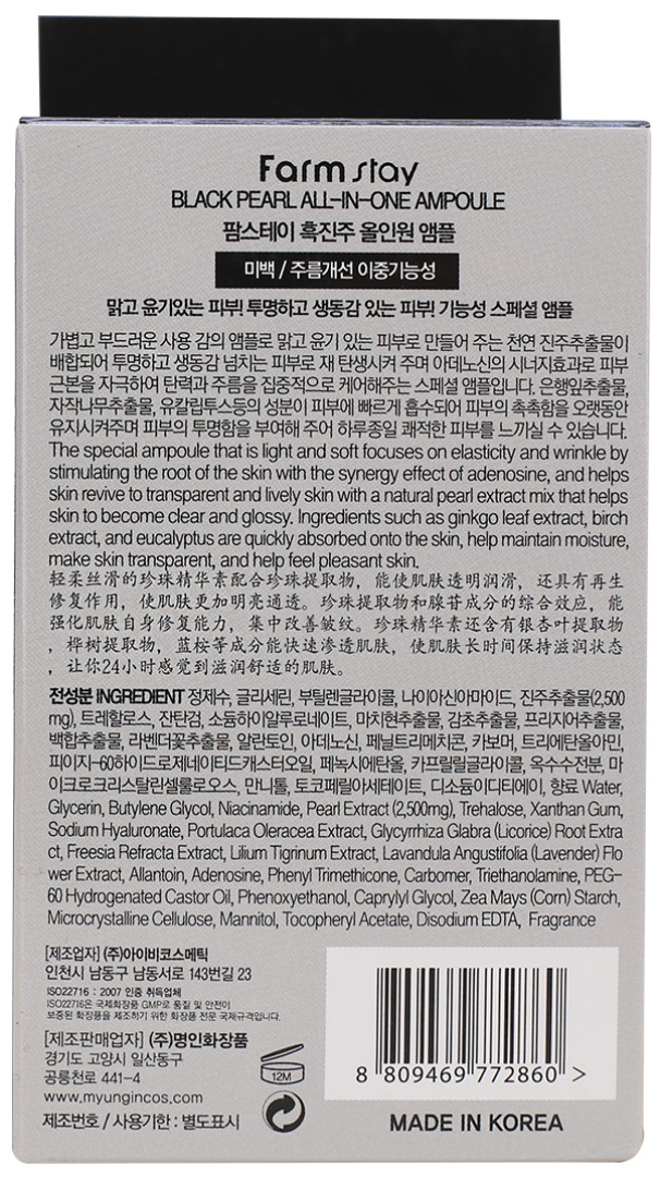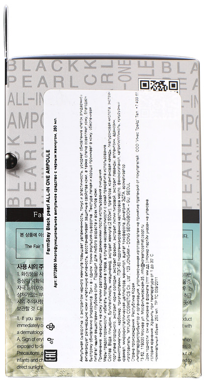 Изготовитель: MYUNGIN COSMETICS CO. LTD., 441-4, Gongneungcheon-ro, Ilsandong-gu, Goyang-si, Gyeonggi-do, РЕСП. КОРЕЯ. Ампульная сыворотка с экстрактом черного жемчуга повышает увлажненность, тонус и эластичность, ускоряет обновление клеток эпидермиса, активизирует регенерацию кожи и клеточную активность, восстанавливает защитные свойства кожи, а также слегка осветляет кожу, благодаря быстрому обновлению эпидермиса. Текстура легкая и хорошо проникает в кожу, обеспечивая питательными веществами глубокие слои. Подходит для любого возраста и всех типов кожи.