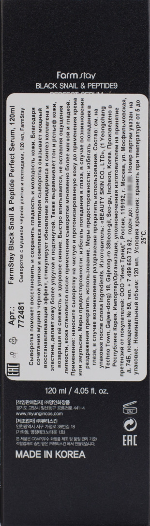 ФМС Peptide9 Сыворотка с муцином чёрной улитки и пептидами FarmStay Black Snail & Peptide9 Perfect Serum, 120ml