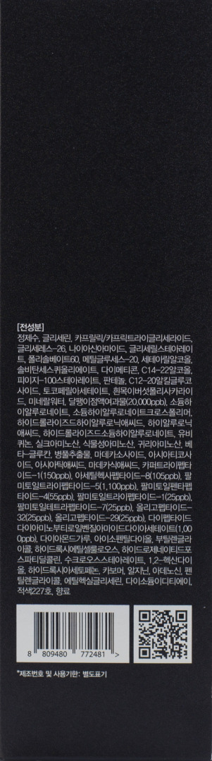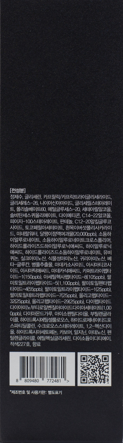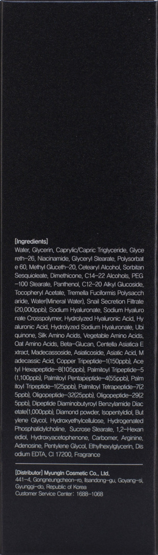 Water, Glycerin, Caprylic/Capric Triglyceride, Glycereth-26, Niacinamide, Glyceryl Stearate, Polysorbate 60, Methyl Gluceth-20, Cetearyl Alcohol, Sorbitan Sesquioleate, Dimethicone, C14-22 Alcohols, PEG-100 Stearate, Panthenol, C12-20 Alkyl Glucoside, Tocopheryl Acetate, Tremella Fuciformis Polysaccharide, Water(Mineral Water), Snail Secretion Filtrate(20000ppb), Sodium Hyaluronate, Sodium Hyaluronate Crosspolymer, Hydrolyzed Hyaluronic Acid, Hyaluronic Acid, Hydrolyzed Sodium Hyaluronate, Ubiquinone, Silk Amino Acids, Vegetable Amino Acids, Oat Amino Acids, Beta-Glucan, Centella Asiatica Extract, Madecassoside, Asiaticoside, Asiatic Acid, Madecassic Acid, Copper Tripeptide-1(150ppb), Acetyl Hexapeptide-8(105ppb), Palmitoyl Tripeptide-5(1.000ppb), Palmitoyl Pentapeptide-4(55ppb), Palmitoyl Tripeptide-1(25ppb), Palmitoyl Tetrapeptide-7(25ppb), Oligopeptide-32(25ppb), Oligopeptide-29(25ppb), Dipeptide Diaminobutyroyl Benzylamide Diacetate(1.000ppb), Diamond powder, Isopentyldiol, Butylene Glycol, Hydroxyethylce