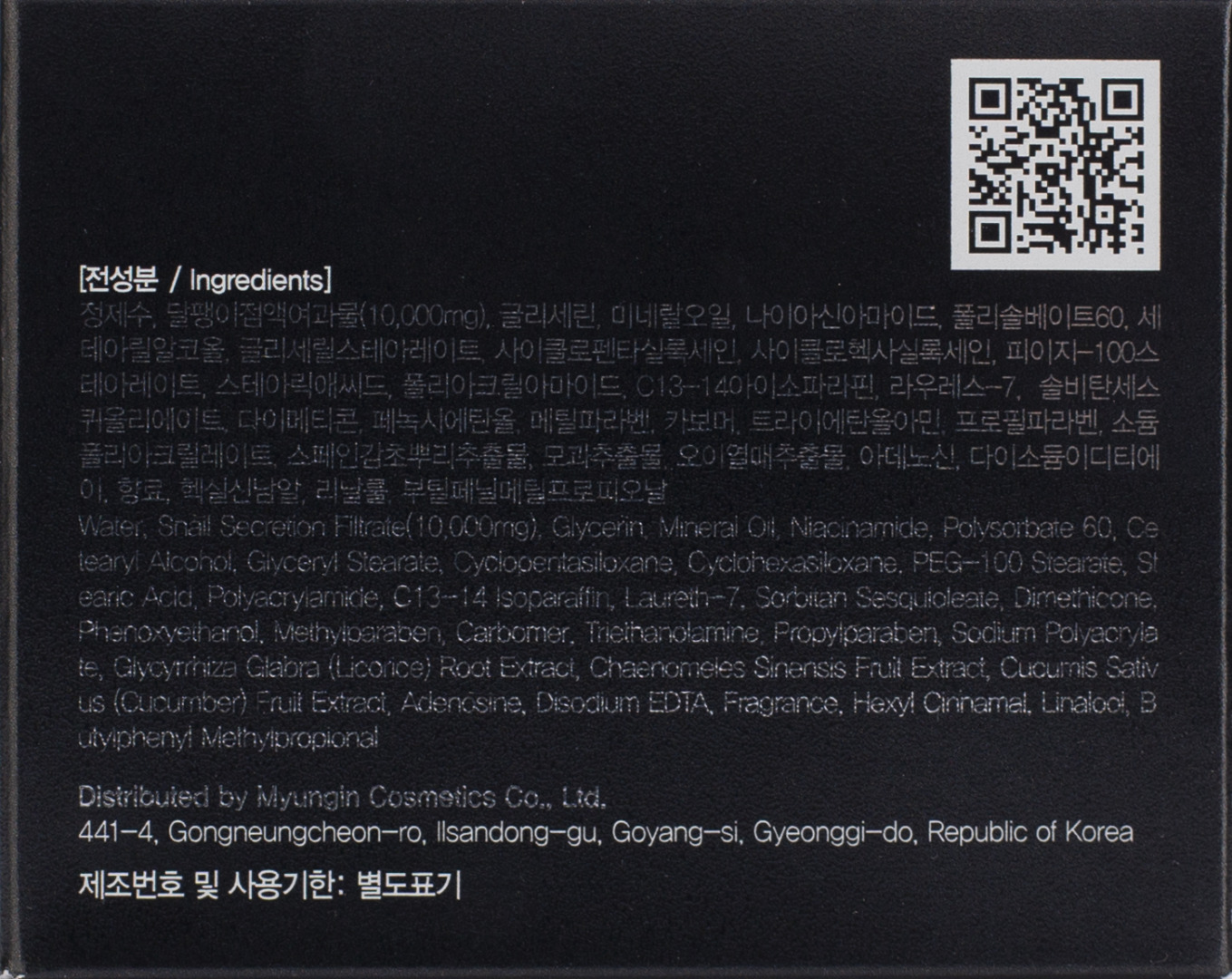 Water, Snail Secretion Filtrate, Glycerin, Mineral Oil, Niacinamide, Polysorbate 60, Cetearyl Alcohol, Cyclopentasiloxane, Cyclohexasiloxane, Glyceryl Stearate, PEG-100 Stearate, Stearic acid, Polyacrylamide, С13-14 lsoparaffin, Laureth-7, Sorbitan Sesquioleate, Dimethicone, Phenoxyethanol, Methylparaben, Carbomer, Triethanolamine, Propylparaben, Sodium Polyacrylate, Glycyrrhiza Glabra (Licorice) Root Extract, Chaenomeles Sinensis Fruit Extract, Cucumis Sativus (Cucumber) Extract, Adenosine, Disodium EDTA, Fragrance.