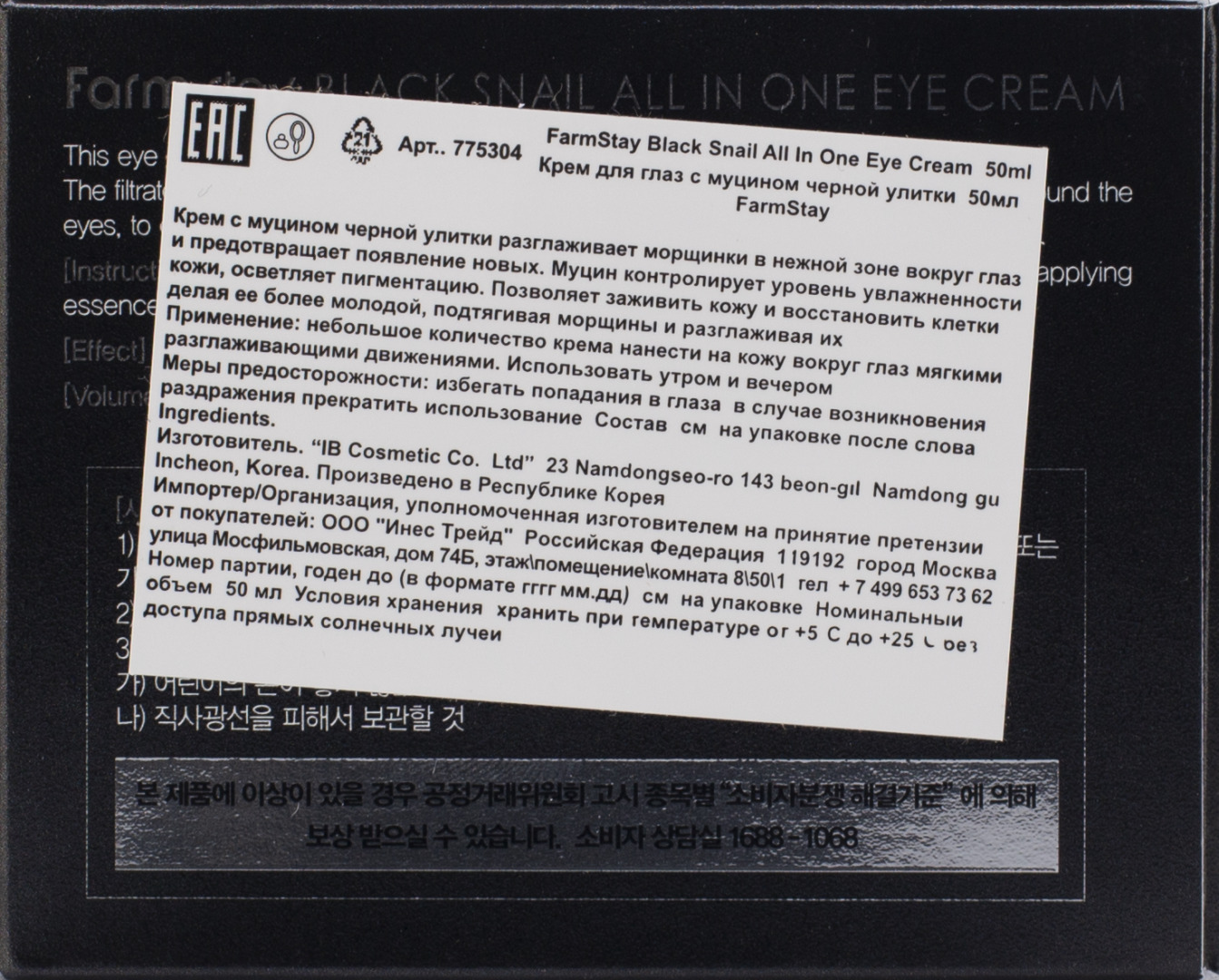 Изготовитель: MYUNGIN COSMETICS CO. LTD., 441-4, Gongneungcheon-ro, Ilsandong-gu, Goyang-si, Gyeonggi-do, РЕСП. КОРЕЯ. Крем с муцином черной улитки разглаживает морщинки в нежной зоне вокруг глаз и предотвращает появление новых. Муцин контролирует уровень увлажненности кожи, осветляет пигментацию. Позволяет заживить кожу и восстановить клетки, делая ее более молодой, подтягивая морщины и разглаживая их. Применение: небольшое количество крема нанести на кожу вокруг глаз мягкими разглаживающими движениями. Использовать утром и вечером.
