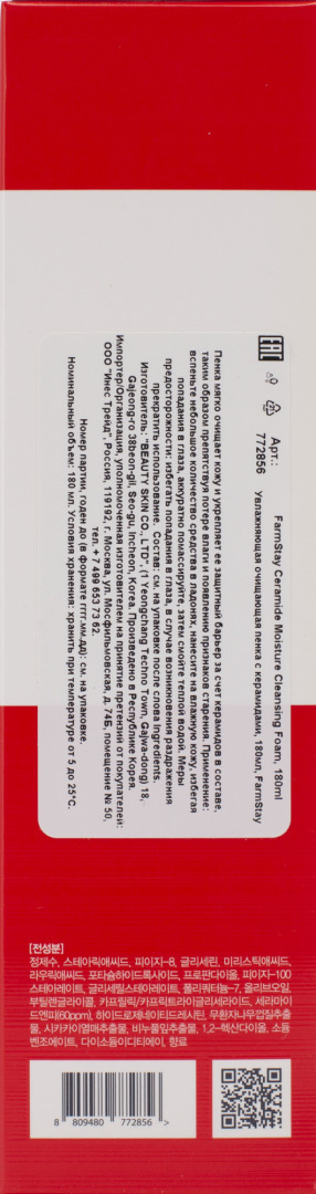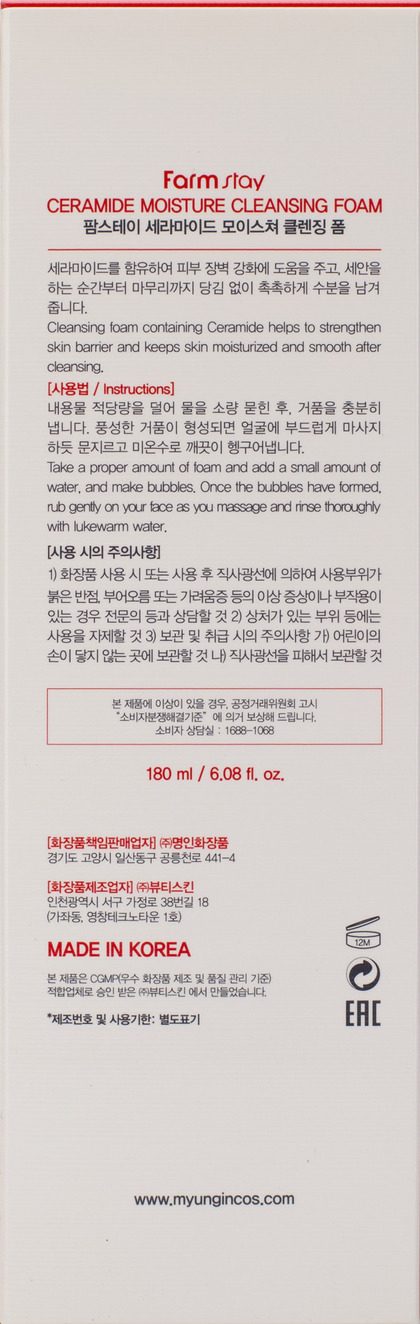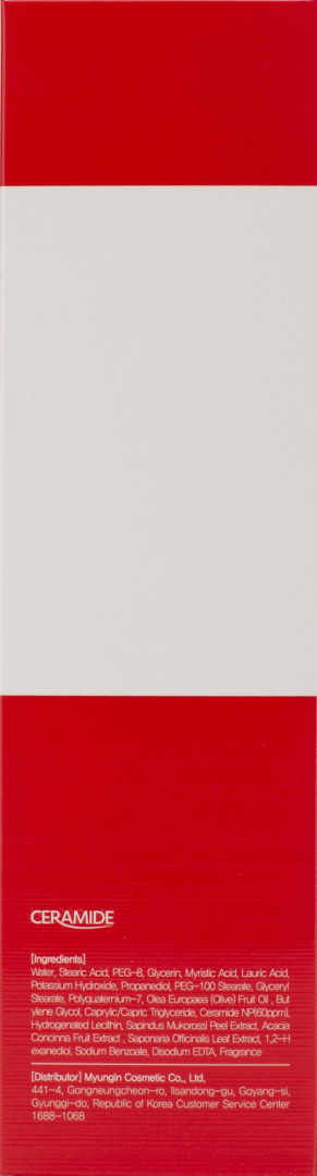 Изготовитель: MYUNGIN COSMETICS CO. LTD., 441-4, Gongneungcheon-ro, Ilsandong-gu, Goyang-si, Gyeonggi-do, РЕСП. КОРЕЯ. Пенка мягко очищает кожу и укрепляет ее защитный барьер за счет керамидов в составе, таким образом препятствуя потере влаги и появлению признаков старения. Применение: вспеньте небольшое количество средства в ладонях, нанесите на влажную кожу, избегая попадания в глаза, аккуратно помассируйте, затем смойте теплой водой.