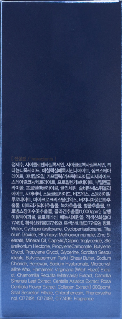 Water, Cyclopentasiloxane, Titanium Dioxide, Ethylhexyl Methoxycinnamate, Zinc Stearate, Mineral Oil, Caprylic/Capric Triglyceride, Stearalkonium Hectorite, Propylene Carbonate, Butylene Glycol, Propylene Glycol, Glycerine, Sorbitan Sesquioleate, Butyrospermum Parkii (Shea) Butter, Sodium Chloride, Beeswax, Sodium Hyaluronate, Microcrystaline Wax, Hamamelis Virginiana (Witch Hazel) Extract, Chamomilia Recutita (Matricaria) Extract, Camellia Sinensis Leaf Extract, Centella Asiatica Extract, Rosa Centifolia Flower Extract, Collagen Extract (1,000ppm), Snail Secretion Filtrate, Chlorphenesin, Phenoxyethanol, СI77491, СI77492, СI77499, Fragrance.
