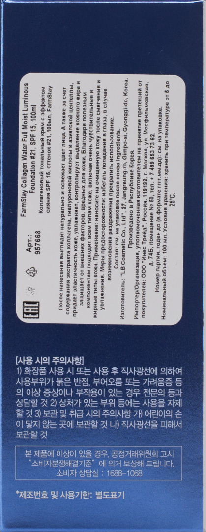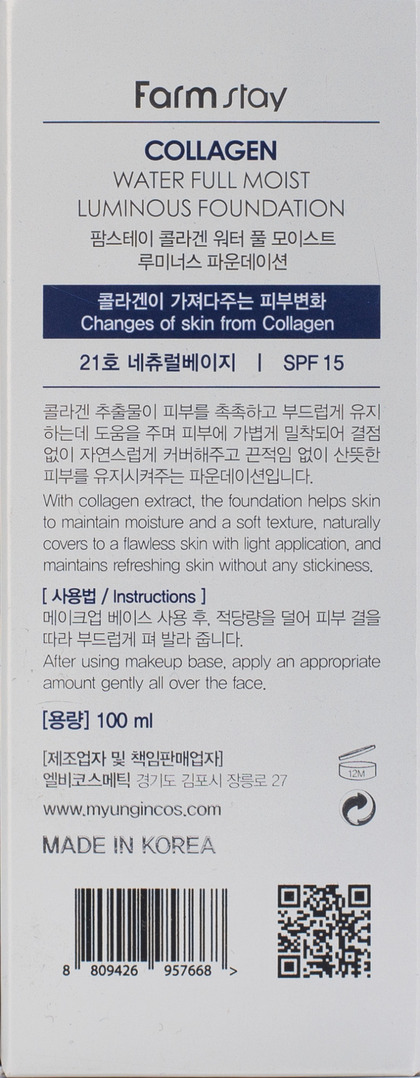 ФМС Collagen Крем тональный коллагеновый с эффектом сияния # 21 FarmStay Collagen Water Full Moist Luminous Foundation #21, SPF 15, 100ml