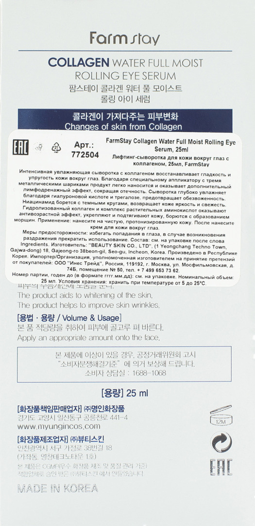 Изготовитель: MYUNGIN COSMETICS CO. LTD., 441-4, Gongneungcheon-ro, Ilsandong-gu, Goyang-si, Gyeonggi-do, РЕСП. КОРЕЯ. Интенсивная увлажняющая сыворотка с коллагеном восстанавливает гладкость и упругость кожи вокруг глаз. Благодаря специальному аппликатору с тремя металлическими шариками продукт легко наносится и оказывает дополнительный лимфодренажный эффект, сокращая отечность. Сыворотка глубоко увлажняет благодаря гиалуроновой кислоте и трегалозе, предотвращает обезвоженность. Ниацинамид борется с темными кругами, возвращает коже яркость и свежесть. Гидролизованный коллаген и комплекс растительных аминокислот оказывают антивозрастной эффект, укрепляют и подтягивают кожу, борются с образованием морщин. Применение: нанесите на чистую, протонизированную кожу. После нанесите крем для кожи вокруг глаз.