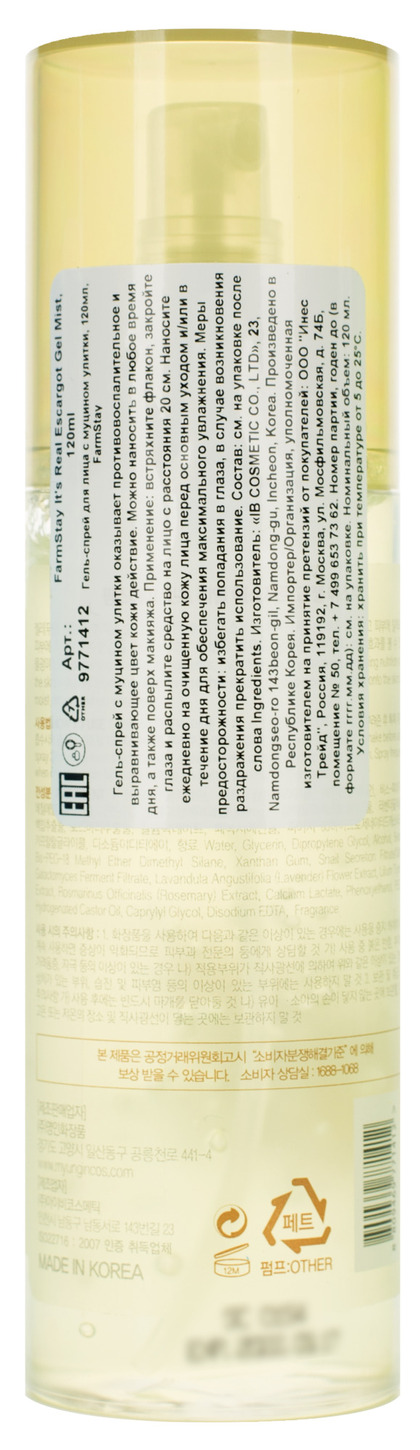 Изготовитель: MYUNGIN COSMETICS CO. LTD., 441-4, Gongneungcheon-ro, Ilsandong-gu, Goyang-si, Gyeonggi-do, РЕСП. КОРЕЯ. Гель-спрей с муцином улитки оказывает противовоспалительное и выравнивающее цвет кожи действие. Можно наносить в любое время дня, а также поверх макияжа. Применение: встряхните флакон, закройте глаза и распылите средство на лицо с расстояния 20 см. Наносите ежедневно на очищенную кожу лица перед основным уходом и/или в течение дня для обеспечения максимального увлажнения.