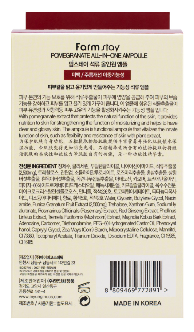 Изготовитель: MYUNGIN COSMETICS CO. LTD., 441-4, Gongneungcheon-ro, Ilsandong-gu, Goyang-si, Gyeonggi-do, РЕСП. КОРЕЯ. Ампульная сыворотка с экстрактом граната увлажняет и питает кожу необходимыми витаминами. Кожа гладкая и сияющая. Гранат богат антиоксидантами, защищает от негативного воздействия окружающей среды, стимулирует естественное обновление кожи.