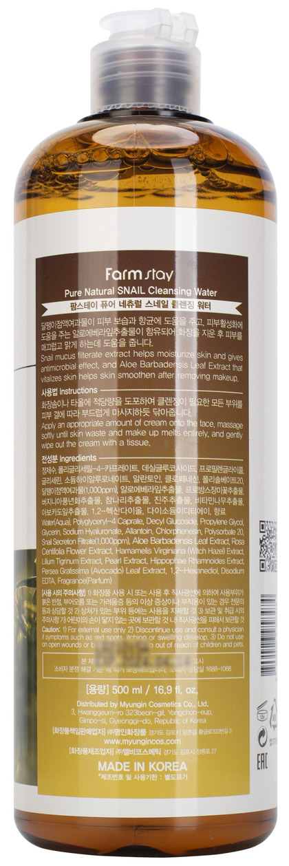 Изготовитель: MYUNGIN COSMETICS CO. LTD., 441-4, Gongneungcheon-ro, Ilsandong-gu, Goyang-si, Gyeonggi-do, РЕСП. КОРЕЯ. Специальная очищающая вода для кожи лица. Очищает от макияжа и загрязнений, освежает кожу и подготавливает ее к нанесению средств ухода. Бережно растворяет макияж, не травмируя и не раздражая кожу. Экстракт муцина улитки оздоравливает кожу, выравнивает цвет лица. Удобный формат флакона с помповым дозатором. Подходит для всех типов кожи. Позволяет смыть макияж без остатка даже в самых неудобных условиях, когда нет воды под рукой. Применение: при помощи помпового дозатора смочить ватный диск в очищающей воде. Затем протирать кожу, меняя ватные диски до тех пор, пока они не будут оставаться чистыми. После этого можно сполоснуть кожу водой и/или продолжить свой ежедневный уход за кожей.