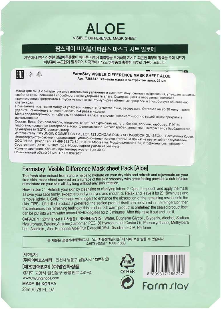 ФМС VD Маска тканевая FarmStay Visible Difference Mask Sheet Aloe, 23ml