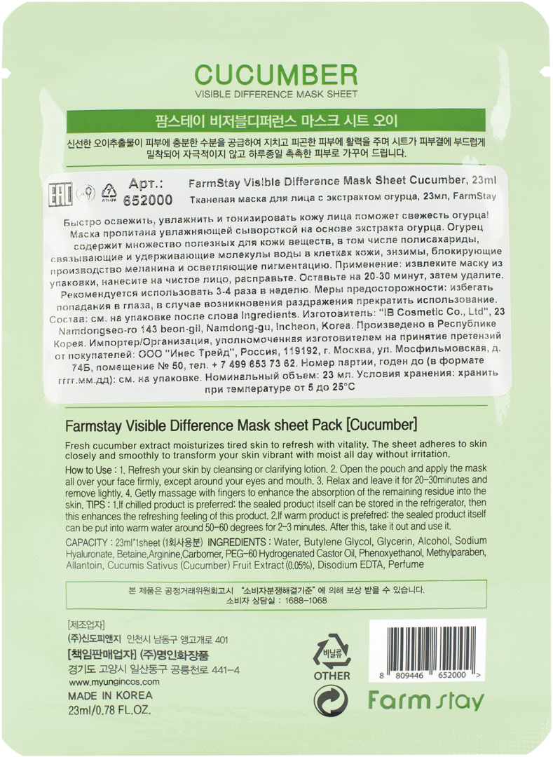Изготовитель: MYUNGIN COSMETICS CO. LTD., 441-4, Gongneungcheon-ro, Ilsandong-gu, Goyang-si, Gyeonggi-do, РЕСП. КОРЕЯ. Быстро освежить, увлажнить и тонизировать кожу лица поможет свежесть огурца! Маска пропитана увлажняющей сывороткой на основе экстракта огурца. Огурец содержит множество полезных для кожи веществ, в том числе полисахариды, связывающие и удерживающие молекулы воды в клетках кожи, энзимы, блокирующие производство меланина и осветляющие пигментацию.