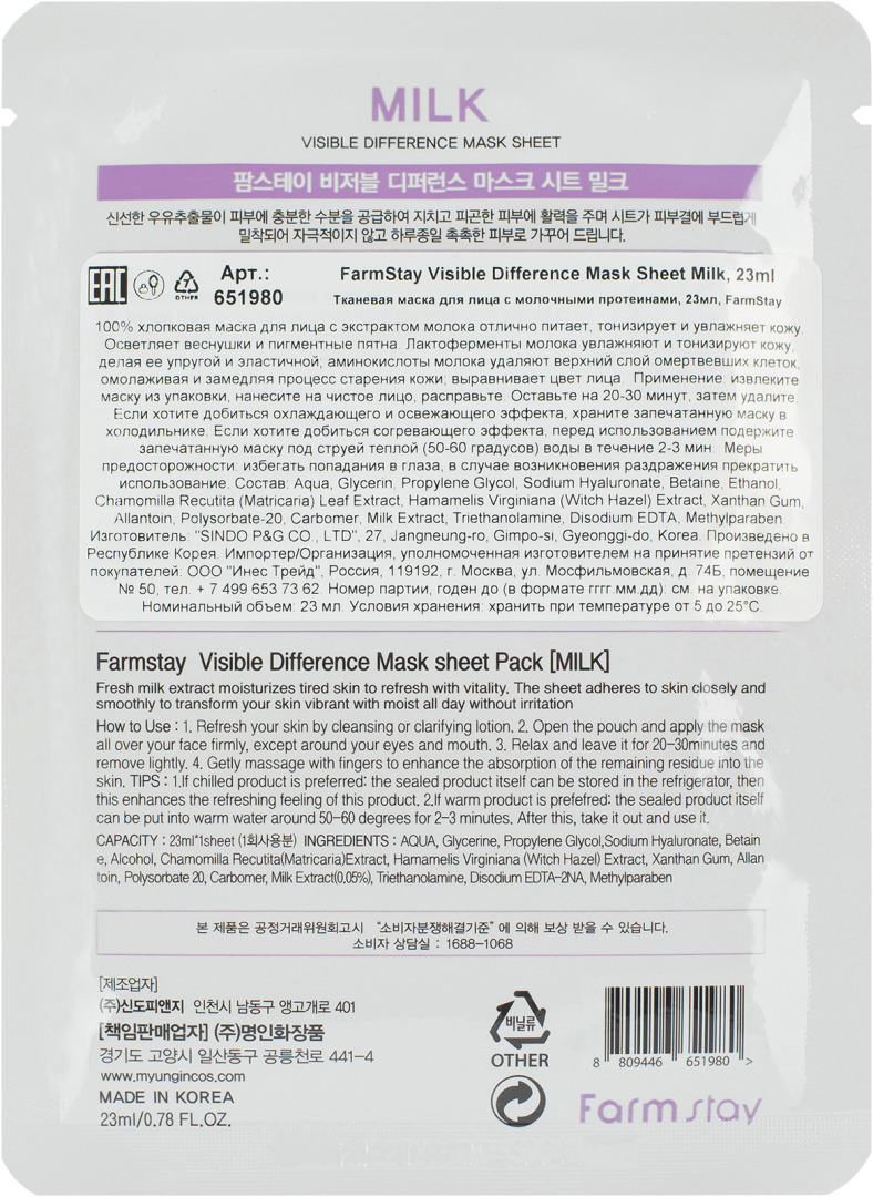 ФМС VD Маска тканевая FarmStay Visible Difference Mask Sheet Milk, 23ml