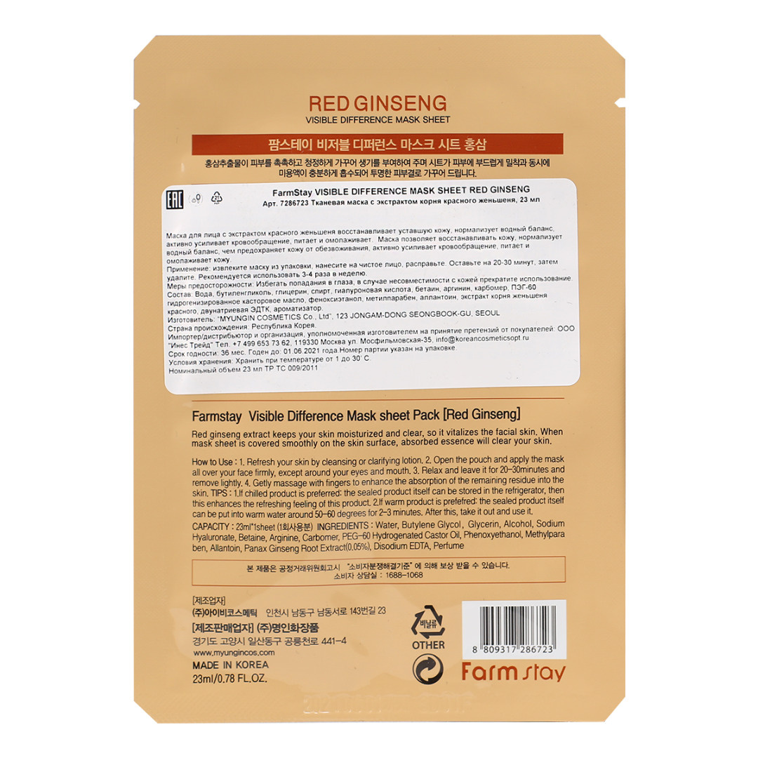 Пр-ль: MYUNGIN COSMETICS CO. LTD., 441-4, Gongneungcheon-ro, Ilsandong-gu, Goyang-si, Gyeonggi-do, РЕСП. КОРЕЯ. Маска для лица с экстрактом красного женьшеня восстанавливает уставшую кожу, нормализует водный баланс, активно усиливает кровообращение, питает и омолаживает.