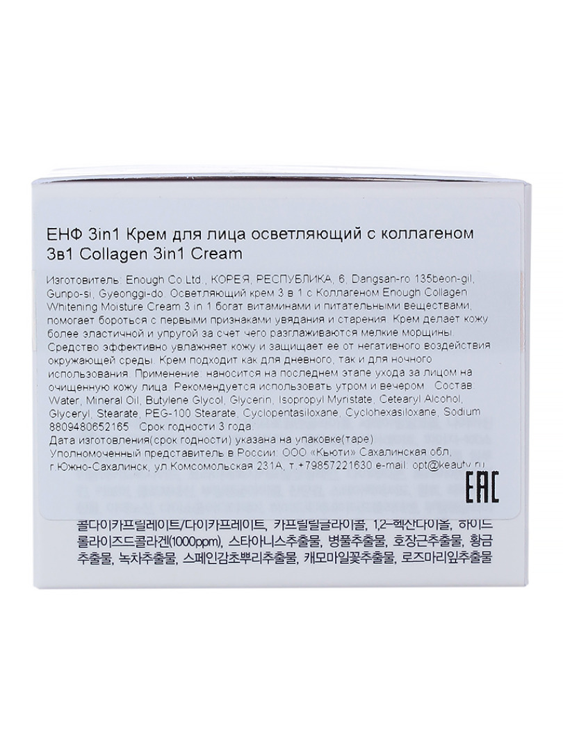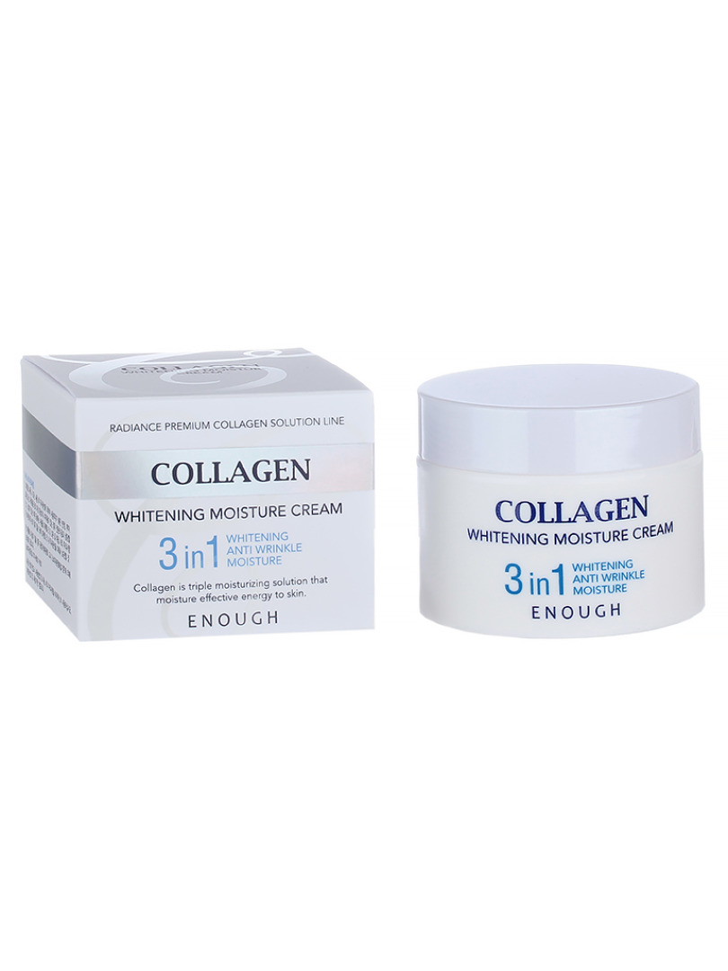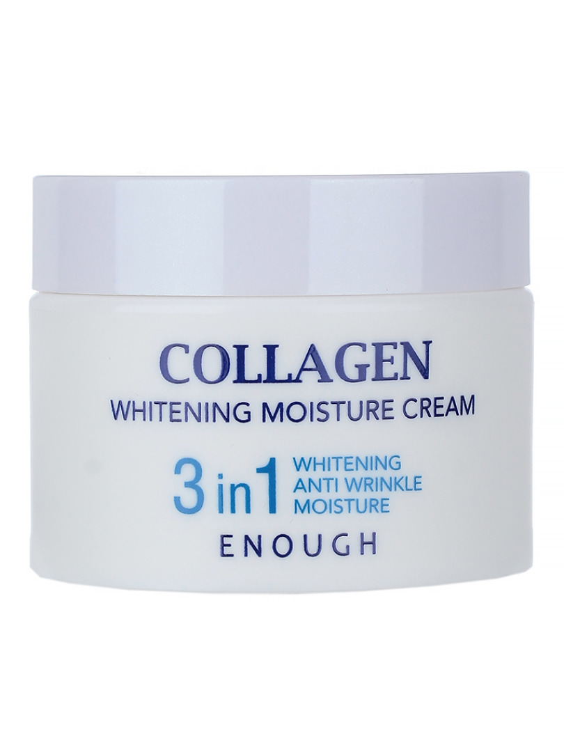 Изготовитель: Enough Co.Ltd., КОРЕЯ, РЕСПУБЛИКА, 6, Dangsan-ro 135beon-gil, Gunpo-si, Gyeonggi-do. Осветляющий крем 3 в 1 с Коллагеном Enough Collagen Whitening Moisture Cream 3 in 1 богат витаминами и питательными веществами, помогает бороться с первыми признаками увядания и старения. Крем делает кожу более эластичной и упругой за счет чего разглаживаются мелкие морщины. Средство эффективно увлажняет кожу и защищает ее от негативного воздействия окружающей среды. Крем подходит как для дневного, так и для ночного использования. Применение: наносится на последнем этапе ухода за лицом на очищенную кожу лица. Рекомендуется использовать утром и вечером.