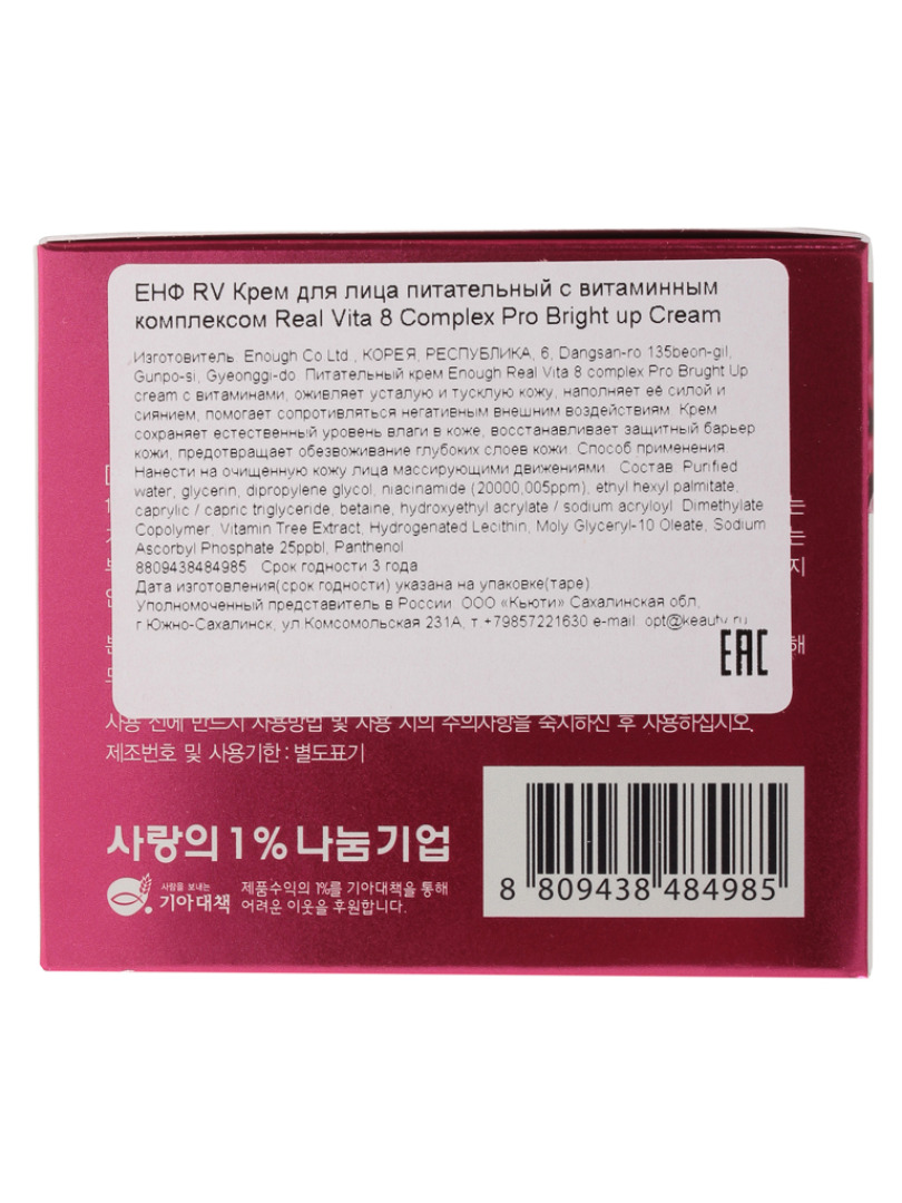 Изготовитель: Enough Co.Ltd., КОРЕЯ, РЕСПУБЛИКА, 6, Dangsan-ro 135beon-gil, Gunpo-si, Gyeonggi-do. Питательный крем Enough Real Vita 8 complex Pro Brught Up cream с витаминами, оживляет усталую и тусклую кожу, наполняет её силой и сиянием, помогает сопротивляться негативным внешним воздействиям. Крем сохраняет естественный уровень влаги в коже, восстанавливает защитный барьер кожи, предотвращает обезвоживание глубоких слоев кожи. Способ применения: Нанести на очищенную кожу лица массирующими движениями.