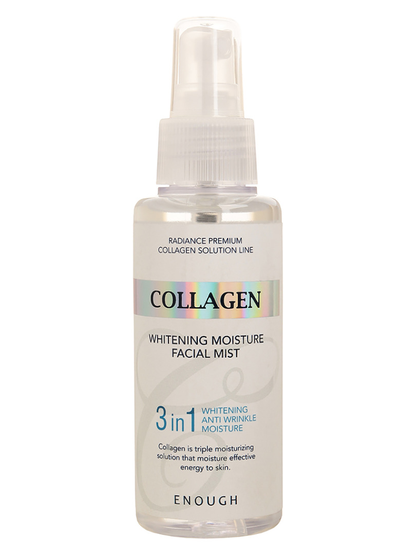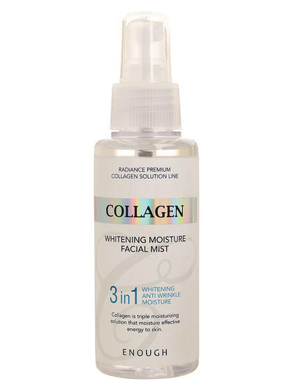 Изготовитель: Enough Co.Ltd., КОРЕЯ, РЕСПУБЛИКА, 6, Dangsan-ro 135beon-gil, Gunpo-si, Gyeonggi-do. Осветляющий мист Enough W Collagen Whitening Moisture Facial Mist мгновенно увлажняет и освежает кожу лица, устраняя внешние следы усталости на лице. Создает защитный слой, препятствующий потере влаги. Спрей можно использовать как до нанесения макияжа, так и после его завершения для закрепления макияжа или устранения ощущения сухости и стянутости кожи в течение дня. Способ применения: Закрыть глаза и распылить мист с расстояния 20 см, мягкими похлопывающими движениями помочь средству впитаться.