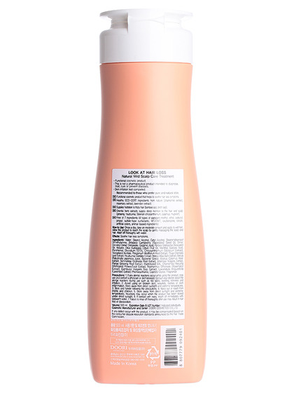 Изготовитель: DOORI COSMETICS Co., LTD., КОРЕЯ, РЕСПУБЛИКА, 588, Dabok-ro, Chubu-myeon, Geumsan-gun, Chungcheongnam-do. Бальзам Look at Hair Loss Natural Mild Scalp Care Treatment для чувствительной, сухой кожи головы. Экстракты азиатских растений, таких как женьшень, хауттюйния и аира, питают кожу головы. Ингредиенты (ромашка, розмарин, лаванда), дарят ощущение легкой свежести. Экстракты бамбуковой и березовой мякоти и березового сока богаты питательными веществами и увлажняют кожу головы и волосы. Способ применения: нанесите достаточное количество средства на кожу головы и влажные волосы по всей длине, помассируйте и тщательно смойте прохладной водой.