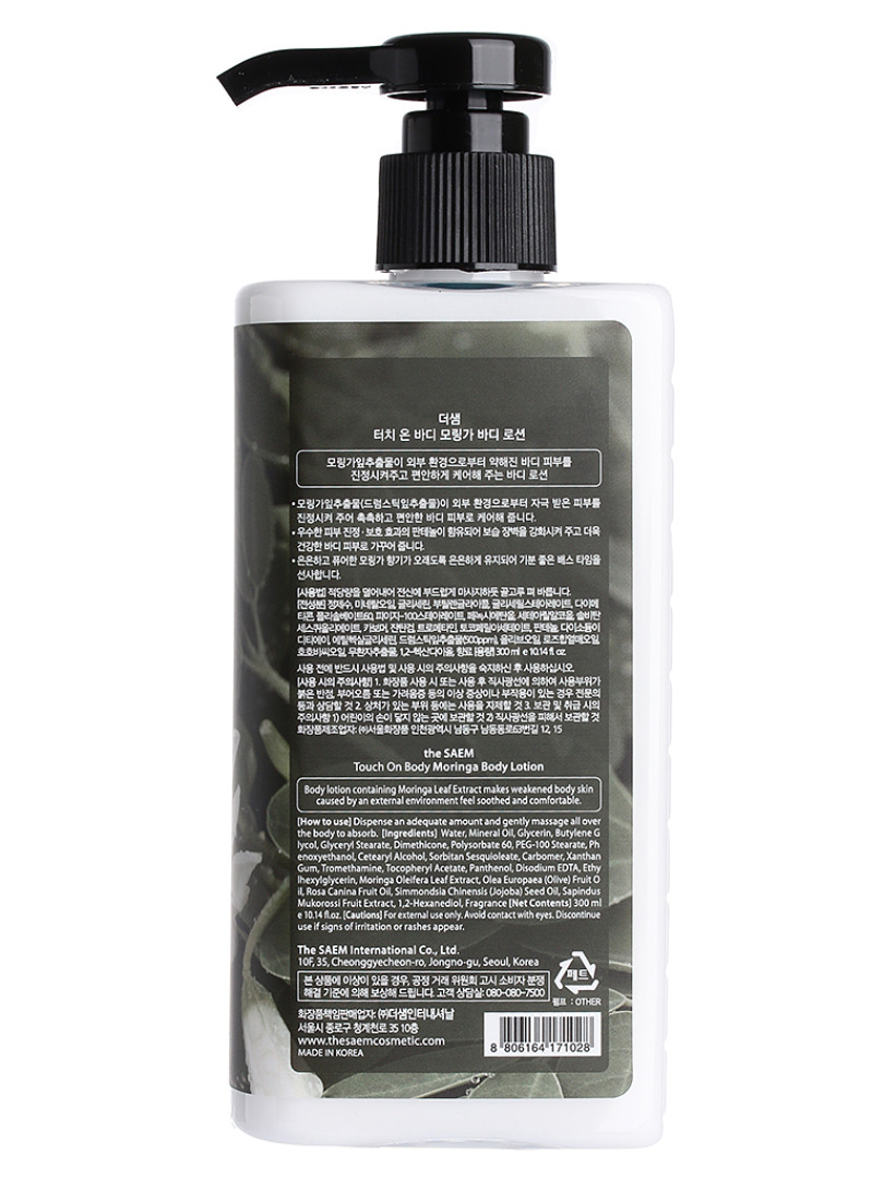 Изг-ль: THE SAEM INTERNATIONAL CO.LTD., КОРЕЯ, РЕСПУБЛИКА, 10F, 35, Cheonggyecheon-ro, Jongno-gu, Seoul. Лосьон для тела с экстрактом моринга, содержит смесь растительных компонентов, включая оливковое масло и масло жожоба, которые питают и разглаживают кожу. Пантенол оказывает успокаивающее и увлажняющее действие, укрепляя кожный барьер. Текстура лосьона, как и аромат, очень приятная, хорошо распределяется по коже, мгновенно увлажняет кожу и оставляет ее увлажненной в течение длительного времени. Содержит экстракт листьев моринги для успокоения раздраженной кожи. Способ применения: нанести на чистую сухую кожу тела.