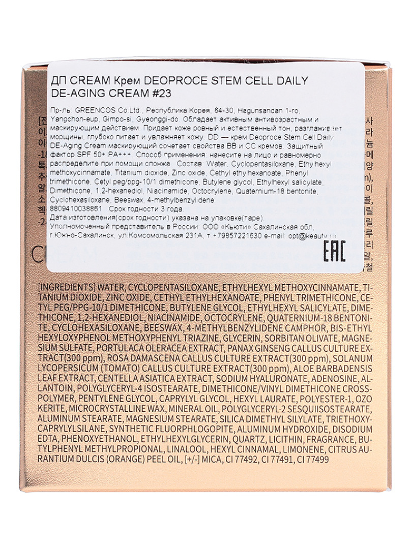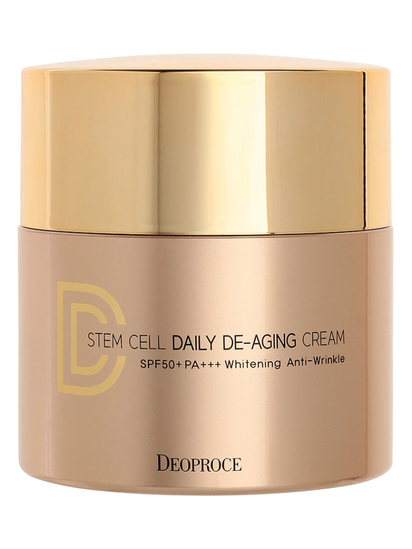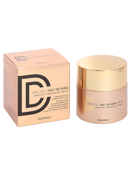Изготовитель: GREENCOS Co.Ltd., Республика Корея, 64-30, Hagunsandan 1-ro, Yangchon-eup, Gimpo-si, Gyeonggi-do. Обладает активным антивозрастным и маскирующим действием. Придает коже ровный и естественный тон, разглаживает морщины, глубоко питает и увлажняет кожу. DD — крем Deoproce Stem Cell Daily DE-Aging Cream маскирующий сочетает свойства ВВ и СС кремов. Защитный фактор SPF 50+ PA+++. Способ применения: нанесите на лицо и равномерно распределите при помощи спонжа.