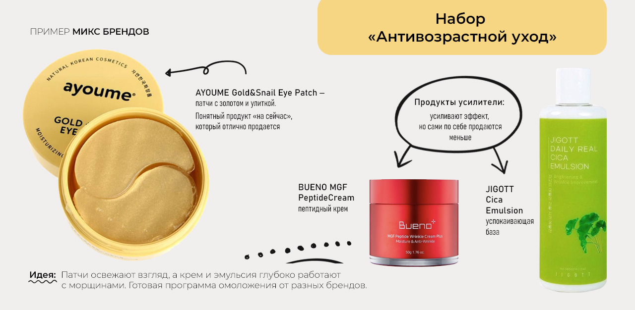Как это работает: берёте популярный продукт, за которым покупатели приходят чаще всего, добавляете к нему средства, усиливающие результат- тонер, сыворотку, крем из другой линейки и даёте понятное название вроде «Упругая кожа», «Антивозрастной уход дома» или «Ровный тон и увлажнение».