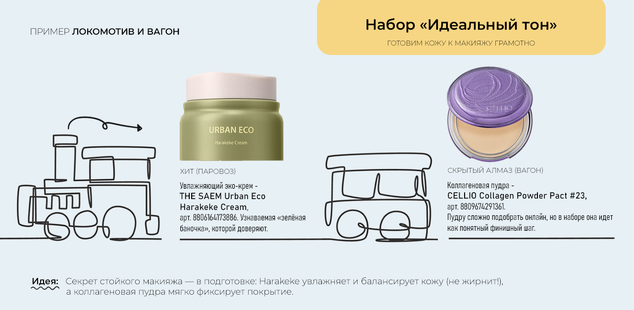- Отдельно отметьте хиты — «локомотивы», вокруг которых строят наборы.