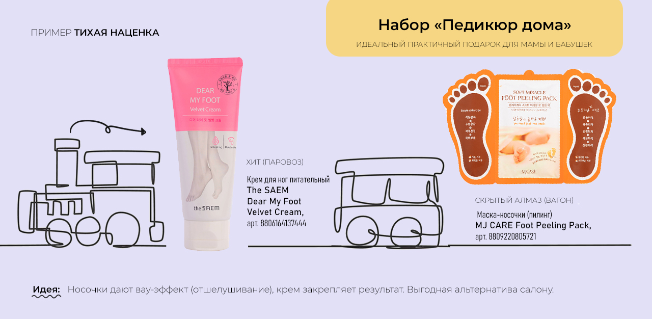 - Придумайте 3–5 наборов: «микс брендов», «локомотив и вагон», «набор с подарком».